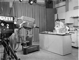 | An early cooking show features Mary Anne Brown. Note TK 11A cameras.   Cam. 1 has four lenses on a turret, and rests on a Houston Fearless pedestal. Cam. 2 has a Zoomar lens, and is mounted on a tripod. |  |