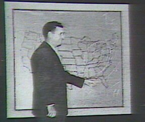 | Channel 13's first staff meteorologist was Charles Stump.  Using his revolving weather map, Stump keeps viewers informed in 1956. Roy Leep would arrive in 1957 and serve WTVT for 40 years. |