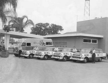 |  | Gaylord's purchase of WTVT in 1956 brought immediate improvements such as a fleet of radio-equipped news wagons. Note original mobile unit at left, and single mast microwave tower at upper right.  A 'twin tower' would replace it later and also support Roy Leep's radar. |