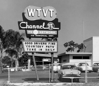 | This 1956 view of the studio's building at 1113 Memorial Hwy (later renamed Grand Central and finally Kennedy Blvd.) shows the familiar curved driveway leading up to the main entrance.  Originally a Greek restaurant, this building served WTVT until its demolition in 1989.  It's possible that WTVT's neon sign covered the restaurant's marquee. |  |